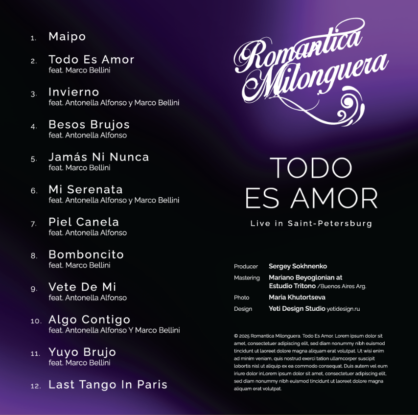 Этот альбом был записан на Петербургской студии грамзаписи (экс Мелодия) в 2023 году, по окончанию оркестрового фестиваля Mucho mas. Уникальной особенностью этой записи является то, что вокалистом на ней выступил, пожалуй один из самых сильных голосов современного танго Roberto Decarre. Сведение и мастеринг проходили на студии Tritono в Буэнос Айресе, обладателем статуэтки Латинской Грэмми, - Mariano Beyoglonian.